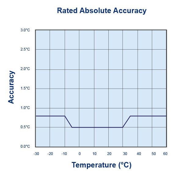 | Accuracy | Better than ±0.5°C (±0.9°F) for -5°C to +30°C (23°F to 86°F). ±0.8°C (±1.5°F) or better for measurements in other areas of rated range. Actual performance is typically much better than the rated values. Please see the Rated Absolute Accuracy chart below. Accuracy figures can be improved by recalibration. |